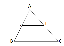 Let’s consider triangle ∆ABC, where D and E are the midpoints of sides AB and AC respectively, and DE is the line segment joining them. We need to prove that DE ∥ BC and DE = \(\frac{1}{2}\) BC. **Proof:** Since D is the midpoint of AB, ∴ AD = DB or, \(\frac{AD}{DB} = 1\) Similarly, since E is the midpoint of AC, ∴ AE = EC or, \(\frac{AE}{EC} = 1\) So, \(\frac{AD}{DB} = \frac{AE}{EC}\) Now, in triangle ∆ABC, since \(\frac{AD}{DB} = \frac{AE}{EC}\), ∴ DE ∥ BC (Proved) Now, in triangles ∆ADE and ∆ABC, ∠ADE = ∠ABC [Because DE ∥ BC and AD is a transversal] ∠AED = ∠ACB [Because DE ∥ BC and AE is a transversal] And ∠DAE = ∠BAC [Common angle] ∴ ∆ADE ∼ ∆ABC (Similar triangles) So, \(\frac{AD}{AB} = \frac{AE}{AC} = \frac{DE}{BC}\) But \(\frac{AD}{AB} = \frac{AE}{AC} = \frac{1}{2}\) [Since D and E are midpoints of AB and AC] ∴ \(\frac{DE}{BC} = \frac{1}{2}\) i.e., DE = \(\frac{1}{2}\) BC (Proved)