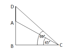 Let AB be the height of the incomplete pillar, and let point C be a location 150 meters away from its base (i.e., BC = 150 m). From point C, the angle of elevation to the top of the pillar A is ∠ACB = 45°. Suppose the pillar is extended up to point D, and now the angle of elevation to the new top D is ∠DCB = 60°. From right-angled triangle ABC: \[ \tan 45^\circ = \frac{AB}{BC} \Rightarrow 1 = \frac{AB}{150} \Rightarrow AB = 150 \text{ meters} \] From right-angled triangle DBC: \[ \tan 60^\circ = \frac{DB}{BC} \Rightarrow \sqrt{3} = \frac{DB}{150} \Rightarrow DB = 150\sqrt{3} = 150 \times 1.732 = 259.8 \text{ meters} \] Therefore, the additional height added to the pillar is: \[ AD = DB - AB = 259.8 - 150 = 109.8 \text{ meters} \] ∴ The pillar must be raised by approximately 109.8 meters.