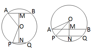 Let’s assume AB = 16 cm and PQ = 12 cm are two parallel chords of a circle with center O. OA = OP = radius of the circle = 10 cm MN = perpendicular distance between the two chords From right-angled triangle MOA, OM² = OA² − AM² = 10² − \((\frac{16}{2})^2\) = 100 − 64 = 36 \(\therefore\) OM = \(\sqrt{36}\) cm = 6 cm Again, from right-angled triangle OPN, ON² = OP² − PN² = 10² − \((\frac{12}{2})^2\) = 100 − 36 = 64 \(\therefore\) ON = \(\sqrt{64}\) cm = 8 cm \(\therefore\) MN = ON + OM = (8 + 6) cm = 14 cm Or, MN = ON − OM = (8 − 6) cm = 2 cm