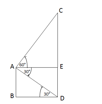 Let AB be a 30-meter high pole and CD be a pillar. From the top of the pole (point A), the foot of the pillar (point D) is seen at a depression angle of 30°, and the top of the pillar (point C) is seen from the base of the pole (point B) at an elevation angle of 60°. A line drawn from point A parallel to BD intersects CD at point E. Since AE || BD, ∠ADB = alternate angle ∠EAD = 30° From the right-angled triangle ABD: \[ \tan 30^\circ = \frac{AB}{BD} = \frac{30}{BD} \Rightarrow \frac{1}{\sqrt{3}} = \frac{30}{BD} \Rightarrow BD = 30\sqrt{3} \] Also, AE = BD = \(30\sqrt{3}\) From the right-angled triangle AEC: \[ \tan 60^\circ = \frac{CE}{AE} = \frac{CE}{30\sqrt{3}} \Rightarrow \sqrt{3} = \frac{CE}{30\sqrt{3}} \Rightarrow CE = 90 \] Now, \[ CD = CE + ED = CE + AB = 90 + 30 = 120 \] Therefore, the height of the pillar CD is 120 meters and the distance between the pole and the pillar BD is \(30\sqrt{3}\) meters.