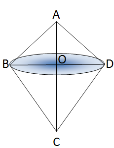Let’s assume triangle ABC has a right angle at ∠B, with AB = 15 cm and BC = 20 cm. ∴ Hypotenuse AC = \( \sqrt{15^2 + 20^2} \) cm = \( \sqrt{625} \) cm = 25 cm Using the area of triangle ABC: \( \frac{1}{2} \times AC \times OB = \frac{1}{2} \times AB \times BC \) i.e., \( 25 \times OB = 15 \times 20 \) ⇒ \( OB = 12 \) cm When triangle ABC is rotated fully around the hypotenuse AC, the solid formed is a bicone (double cone). Each cone has radius OB = 12 cm ∴ Total volume of the bicone = \( \frac{1}{3} \pi \times OB^2 \times OA + \frac{1}{3} \pi \times OB^2 \times OC \) = \( \frac{1}{3} \pi \times OB^2 \times (OA + OC) \) = \( \frac{1}{3} \times \frac{22}{7} \times 12 \times 12 \times 25 \) cubic cm = \( \frac{26400}{7} \) cubic cm = \( 3771 \frac{3}{7} \) cubic cm
