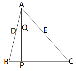 A perpendicular AP is drawn from BC which intersects DE at point Q. Given, \( \frac{AD}{BD} = \frac{3}{5} \) ∴ \( \frac{AQ}{PQ} = \frac{AD}{BD} = \frac{3}{5} \) i.e., \( PQ = \frac{5}{3} AQ \) Again, \( \frac{BD}{AD} + 1 = \frac{5}{3} + 1 \) i.e., \( \frac{BD + AD}{AD} = \frac{5 + 3}{3} \) i.e., \( \frac{AB}{AD} = \frac{8}{3} \) ∴ \( \frac{AP}{AQ} = \frac{BC}{DE} = \frac{8}{3} \) ∴ \( BC = \frac{8}{3} DE \) ∴ Area of triangle ∆ADE : Area of trapezium DBCE = \( \frac{1}{2} \times DE \times AQ : \frac{1}{2} \times (DE + BC) \times PQ \) = \( \frac{1}{2} \times DE \times AQ : \frac{1}{2} \times (DE + \frac{8}{3} DE) \times \frac{5}{3} AQ \) = \( 1 : (1 + \frac{8}{3}) \times \frac{5}{3} \) = \( 1 : \frac{11}{3} \times \frac{5}{3} \) = \( 9 : 55 \)