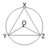 Each angle of an equilateral triangle is 60\(^\circ\). Now, the central angle \(\angle\)YOZ subtended by arc YZ and the inscribed angle \(\angle\)YXZ are related. \(\therefore \angle\)YOZ = 2 × \(\angle\)YXZ = 2 × 60\(^\circ\) = 120\(^\circ\)