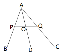 In triangle \( \triangle ABD \), PO is parallel to BD ∴ \( \frac{PO}{BD} = \frac{AO}{AD} \) Again, in triangle \( \triangle ADC \), OQ is parallel to DC ∴ \( \frac{OQ}{DC} = \frac{AO}{AD} \) ∴ \( \frac{PO}{BD} = \frac{OQ}{DC} = \frac{AO}{AD} \) ∴ \( \frac{PO}{BD} = \frac{OQ}{DC} \) ⇒ \( \frac{PO}{OQ} = \frac{DC}{BD} = 1 \) [because BD = DC] ∴ PO : OQ = 1 : 1