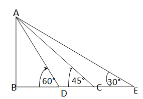 Let AB be a telegraph pole. When the sun’s angle of elevation is 45°, ∠ACB = 45° and the length of the shadow is BC. When the angle of elevation becomes 60°, ∠ADB = 60° and the shadow length is BD. So, CD = 4 meters. When the sun’s angle of elevation is ∠AEB = 30°, the shadow length is BE. From triangle ABC, with ∠ACB = 45°: \[ \tan 45^\circ = \frac{AB}{BC} \Rightarrow 1 = \frac{AB}{BC} \Rightarrow BC = AB \quad \text{---(i)} \] From triangle ABD, with ∠ADB = 60°: \[ \tan 60^\circ = \frac{AB}{BD} \Rightarrow \sqrt{3} = \frac{AB}{BD} \Rightarrow BD = \frac{AB}{\sqrt{3}} \quad \text{---(ii)} \] Now, \[ BC - BD = CD = 4 \Rightarrow AB - \frac{AB}{\sqrt{3}} = 4 \Rightarrow AB\left(1 - \frac{1}{\sqrt{3}}\right) = 4 \Rightarrow AB \times \frac{\sqrt{3} - 1}{\sqrt{3}} = 4 \Rightarrow AB = 4 \times \frac{\sqrt{3}}{\sqrt{3} - 1} \Rightarrow AB = \frac{4\sqrt{3}}{\sqrt{3} - 1} \quad \text{---(iii)} \] From triangle ABE, with ∠AEB = 30°: \[ \tan 30^\circ = \frac{AB}{BE} \Rightarrow \frac{1}{\sqrt{3}} = \frac{AB}{BE} \Rightarrow BE = \sqrt{3} \cdot AB \Rightarrow BE = \sqrt{3} \cdot \frac{4\sqrt{3}}{\sqrt{3} - 1} = \frac{12}{\sqrt{3} - 1} \] Rationalizing the denominator: \[ BE = \frac{12(\sqrt{3} + 1)}{(\sqrt{3} - 1)(\sqrt{3} + 1)} = \frac{12(\sqrt{3} + 1)}{3 - 1} = \frac{12(\sqrt{3} + 1)}{2} = 6(\sqrt{3} + 1) \] Therefore, when the sun’s angle of elevation is 30°, the length of the telegraph pole’s shadow is \[ 6(\sqrt{3} + 1) \text{ meters}. \]
