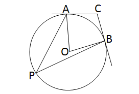 Q.Two tangents are drawn to a circle from points A and B on the circumference, and they intersect at point C. Another point P lies on the circumference, on the side opposite to where point C is located with respect to the center. If \(\angle\)APB = 35°, then what is the measure of \(\angle\)ACB? (a) 145° (b) 55° (c) 110° (d) None of the above