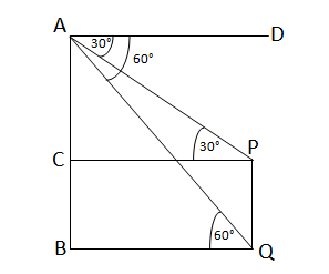 Let AB be a building of height 60 meters. From the top point A, the angles of depression to the top (P) and bottom (Q) of a lamp post PQ are 30° and 60°, respectively. ∴ ∠DAP = 30° and ∠DAQ = 60° [Assume AD ∥ BQ] Draw CP ∥ BQ. Then, ∠APC = alternate angle ∠DAP = 30° ∠AQB = alternate angle ∠DAQ = 60° From right-angled triangle ∆ABQ: \[ \tan 60^\circ = \frac{AB}{BQ} \] \[ \Rightarrow \sqrt{3} = \frac{AB}{BQ} \] \[ \Rightarrow BQ = \frac{AB}{\sqrt{3}} = \frac{60}{\sqrt{3}} = \frac{60\sqrt{3}}{3} = 20\sqrt{3} \] ∴ The horizontal distance between the building and the lamp post is \(20\sqrt{3}\) meters. **[Answer to part (i)]** Now, from right-angled triangle ∆ACP: \[ \tan 30^\circ = \frac{AC}{CP} \] \[ \Rightarrow \frac{1}{\sqrt{3}} = \frac{AC}{CP} \] \[ \Rightarrow AC = \frac{CP}{\sqrt{3}} = \frac{20\sqrt{3}}{\sqrt{3}} = 20 \] ∴ The height of the lamp post is \[ PQ = BC = AB - AC = 60 - 20 = 40 \text{ meters} \] [Answer to part (ii)]