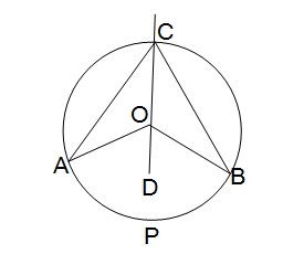 Given: In a circle with center \(O\), the arc \(APB\) subtends a central angle \(\angle AOB\) and an inscribed angle \(\angle ACB\).