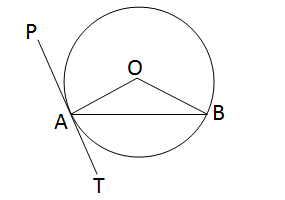 OA = OB = Radius of the circle \(\therefore \angle\)OAB = \(\angle\)OBA = \(\frac{180^\circ - 120^\circ}{2} = 30^\circ\) Again, OA is the radius drawn to the point of tangency \(\therefore \angle\)OAT = \(90^\circ\) \(\therefore \angle\)BAT = \(\angle\)OAT − \(\angle\)OAB = \(90^\circ − 30^\circ = 60^\circ\)