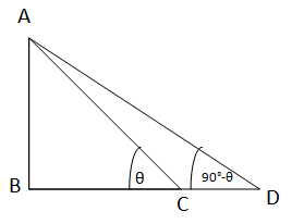 Let AB be the vertical pillar, and points C and D lie on the same straight line on the ground with the base B of the pillar. From points C and D, the angles of elevation to the top of the pillar A are ∠ACB and ∠ADB, which are complementary. Given: BC = 9 meters and BD = 16 meters. Let ∠ACB = \(\theta\) Then, ∠ADB = \(90^\circ - \theta\) From triangle ABC: \[ \tan \theta = \frac{AB}{BC} = \frac{AB}{9} \quad \text{(i)} \] From triangle ABD: \[ \tan(90^\circ - \theta) = \frac{AB}{BD} \Rightarrow \cot \theta = \frac{AB}{16} \Rightarrow \tan \theta = \frac{16}{AB} \quad \text{(ii)} \] Equating equations (i) and (ii): \[ \frac{AB}{9} = \frac{16}{AB} \Rightarrow AB^2 = 144 \Rightarrow AB = \sqrt{144} = 12 \] Therefore, the height of the pillar is 12 meters.