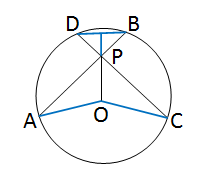 In triangles APO and CPO: AO = OC = radius of the circle \(\angle\)APO = \(\angle\)CPO [because OP is the bisector of ∠APC] OP is common \(\therefore\) \(\triangle\)APO ≅ \(\triangle\)CPO \(\therefore\) AP = CP [corresponding sides] Similarly, by joining DB and extending OP, it can be shown that PB = DP \(\therefore\) AP + PB = CP + DP i.e., AB = CD [Proved]