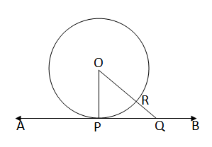 Given: AB is a tangent to a circle centered at O, touching the circle at point P. OP is the radius drawn to the point of contact. To prove: OP ⊥ AB Construction: Take any other point Q on the tangent AB. Join points O and Q. Proof: Any point on the tangent AB other than the point of contact P lies outside the circle. Therefore, the line OQ will intersect the circle at some point. Let that point of intersection be R. ∴ OR < OQ [∵ R lies between O and Q] Also, OP < OQ Since Q is any point on the tangent AB, and OP is the shortest distance from the center O to the tangent, and the shortest distance from a point to a line is the perpendicular distance, ∴ OP ⊥ AB (Proved)