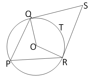 Since OQ and OR are radii drawn to the points of tangency of the tangents, Therefore, ∠OQS and ∠ORS are both 90°. In quadrilateral OQSR: ∠QOR = 360° − (∠OQS + ∠ORS + ∠QSR) = 360° − (90° + 90° + 70°) = 360° − 250° = 110° Now, ∠QOR is the central angle subtending arc QTR, and ∠QPR is the inscribed angle subtending the same arc. Therefore, ∠QPR = ½ × ∠QOR = ½ × 110° = 55°